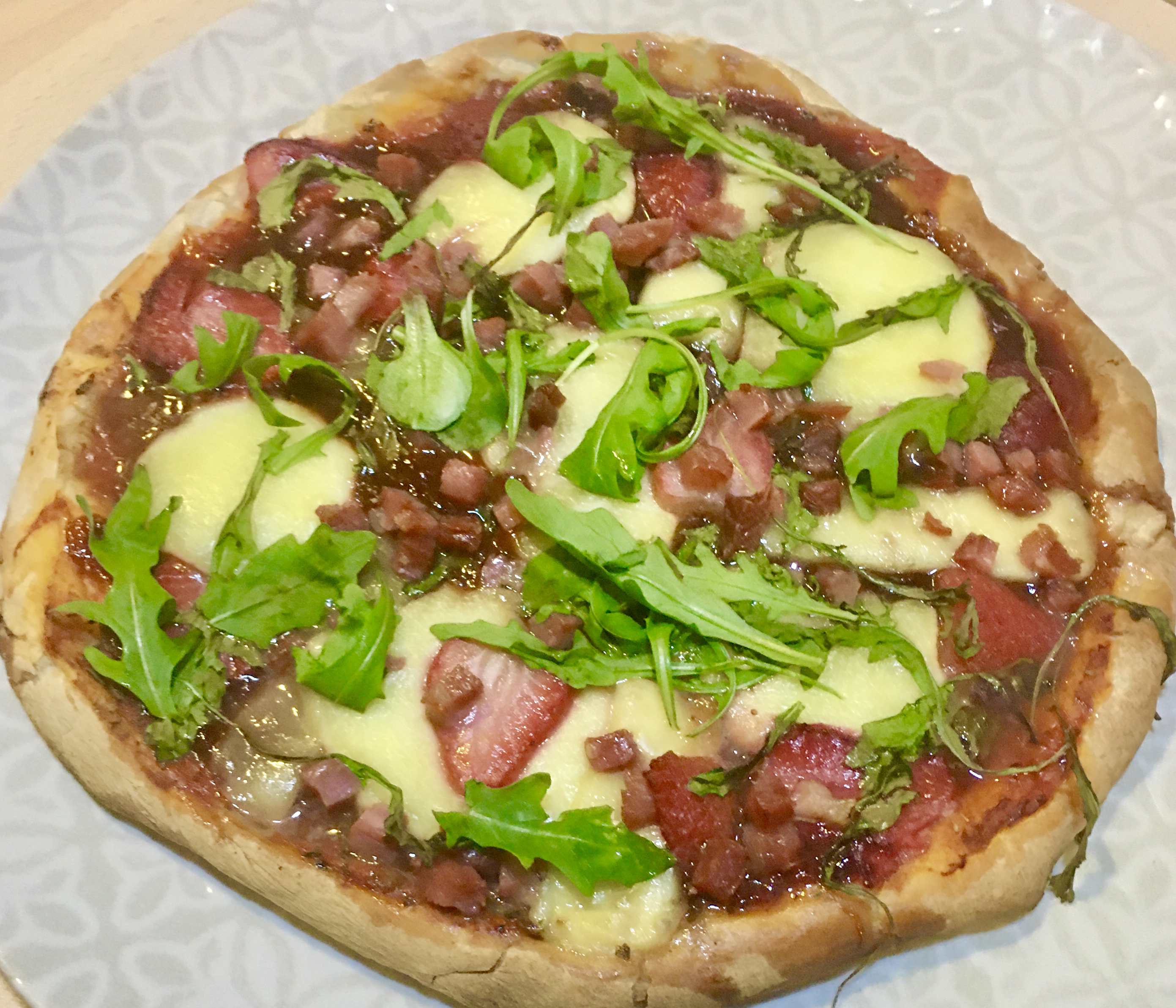 Pizza con mermelada picante de fresas, jamón y rúcula