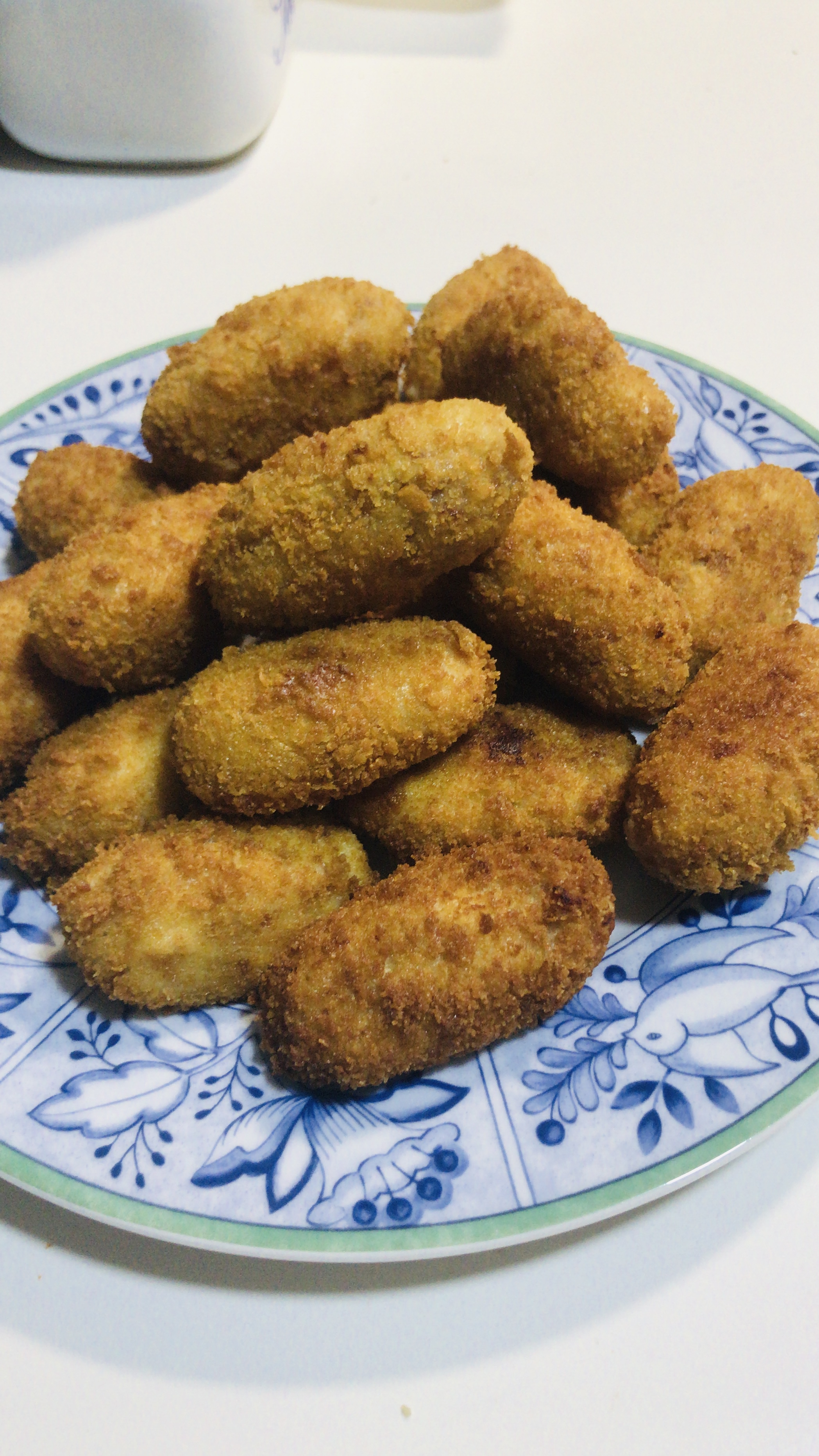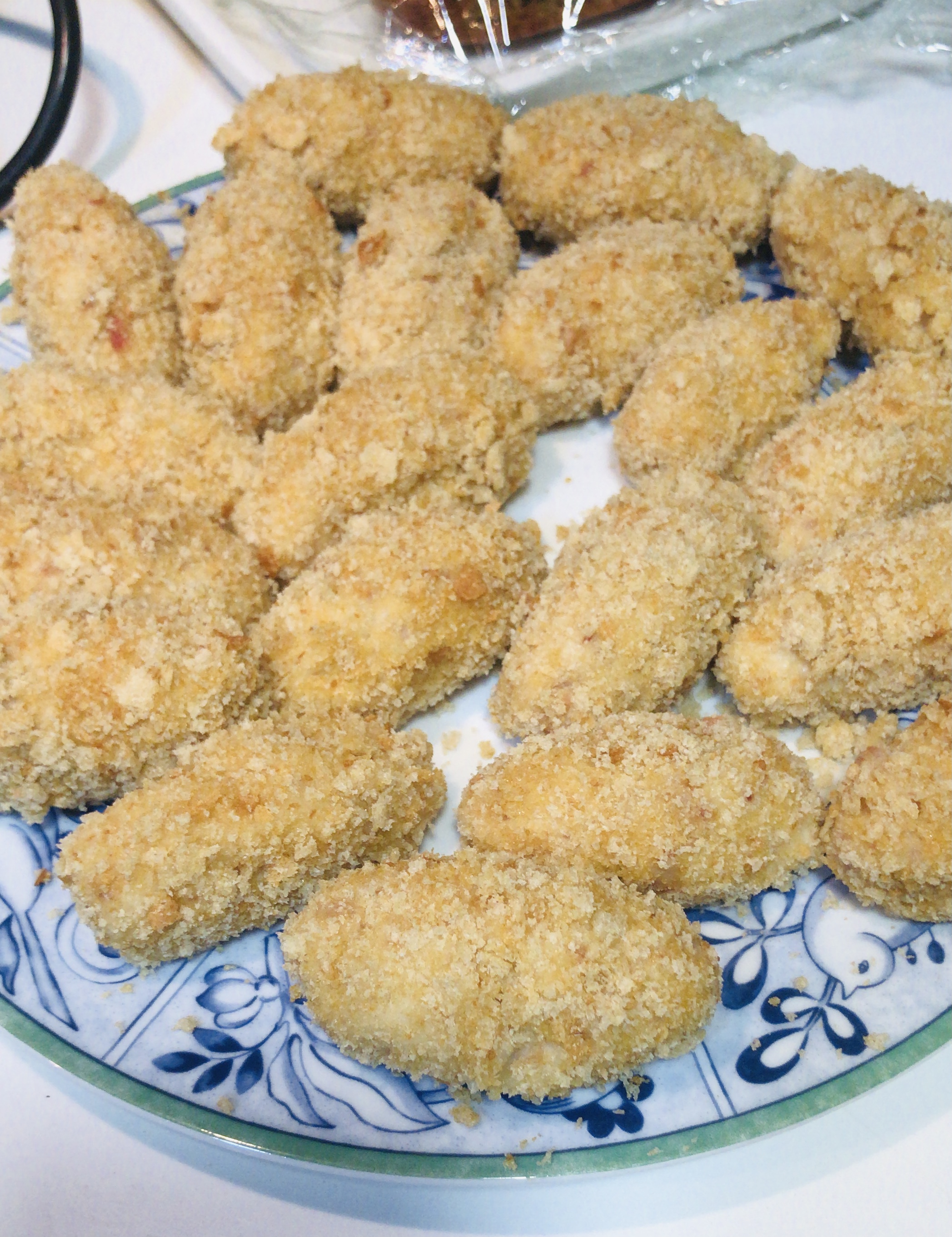 Estas son las croquetas preparadas ya para freír en un cazo a fuego medio alto y friéndolas de 5 en 5 (el aceite tiene que estar muy caliente pero no humeante, se trata de freírlas en caliente para que no se estallen pero que no se quemen).