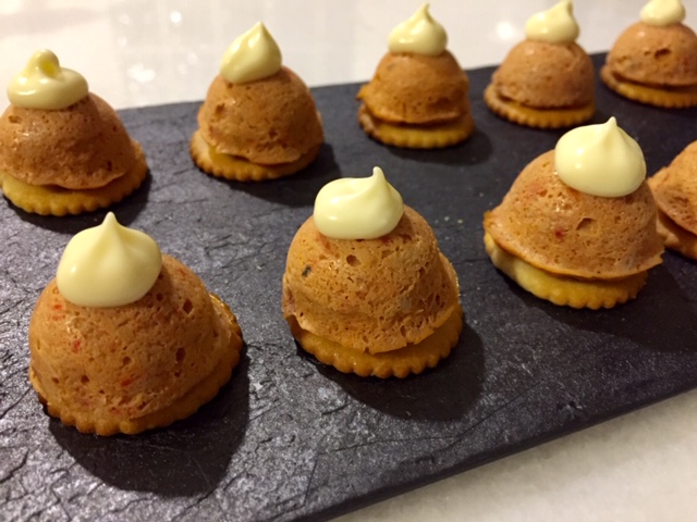- Desmoldamos y servimos sobre una galleta salada decorado con mayonesa y cebollino.