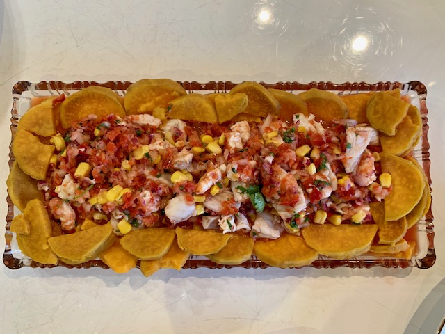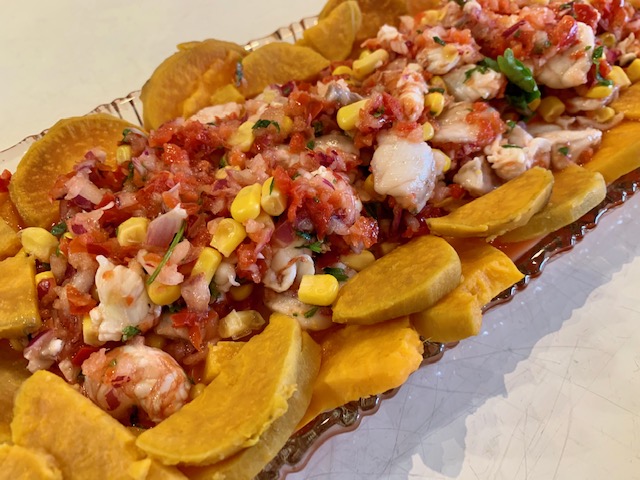 Ceviche de lubina y langostinos con maiz y batata con Thermomix