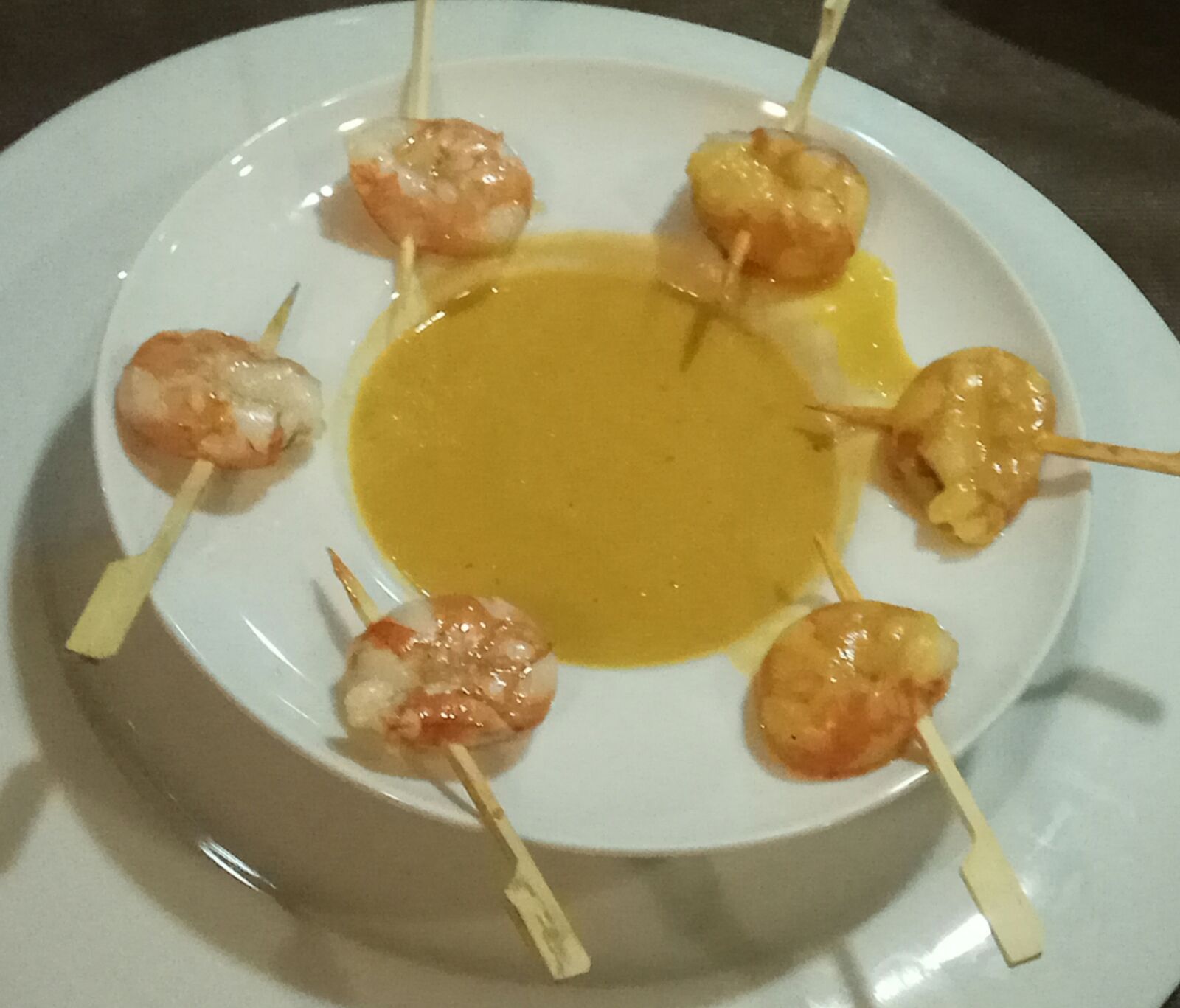 - Servimos el chupito decorado con los bombones de gambón pichados en la brocheta y unas gotas de aceite del sofrito.