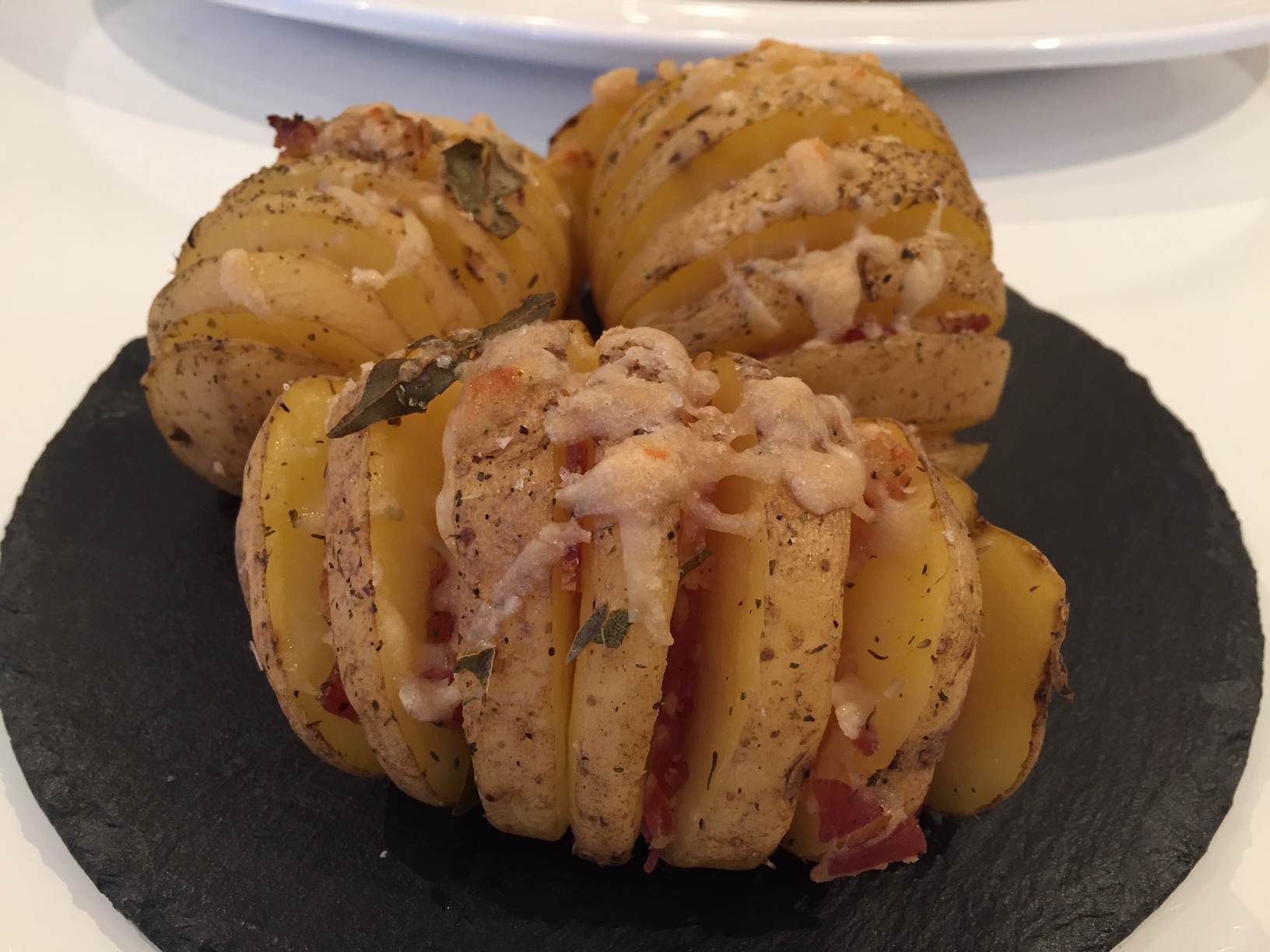 - Coloque el Varoma con las patatas Hasselback y retire cuando termine sin destapar el Varoma para que se terminen de hacer con el calor residual).