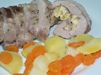 - Ponla sobre el solomillo y cierralo formando un rulo, aprieta bien con el film, y pon otro film para que este no se abra. Coloca el solomillo en el recipiente varoma junto con patata troceada y zanahoria a rodajas.