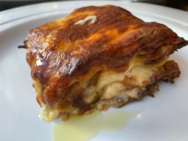 Con otra parte del preparado de carne preparamos la lasaña alternando capas de carne con placas de pasta, previamente remojadas en agua caliente. Preparamos una bechamel con cebollita y gratinamos con queso.