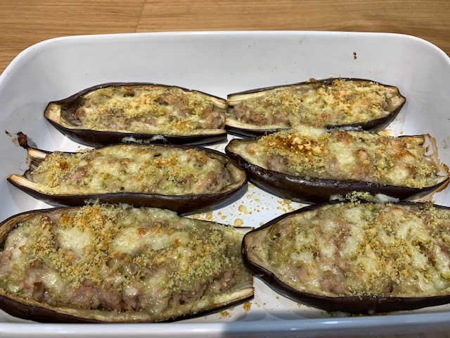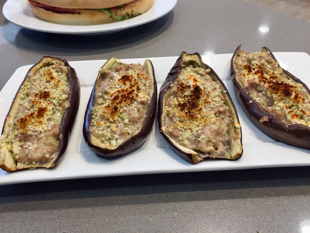 Con parte de este preparado de carne, rellenamos las berenjenas, espolvoreamos con el pan rallado y regamos con un hilo de aceite y gratinamos 20-25 min a 200º.