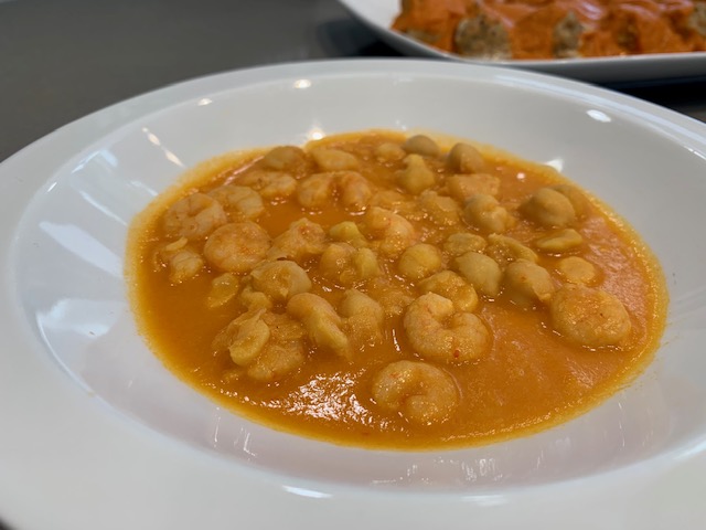 - Añadir a la salsa restante 300 g de agua, los garbanzos y las gambas peladas. Programar 10 min/varoma/giro inverso/vel 1’5. Reservar el potaje en una fuente. Lavar el vaso