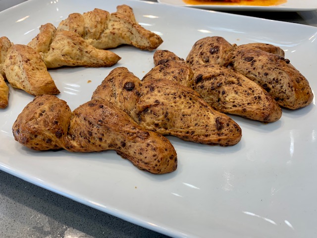 - Formamos un rulo, y con las palmas de las manos, le damos un poco de forma de "cresta" como triangular, con tijeras cortamos trozos sin llegar al final de la masa y vamos colocándolos alternativamente a derecha e izquierda formando la espiga.