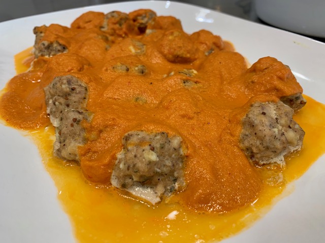 - Triturar el resto de la salsa 15 min/vel 10. Poner las albóndigas en recipiente y salsear con parte de la salsa triturada. Reservar.