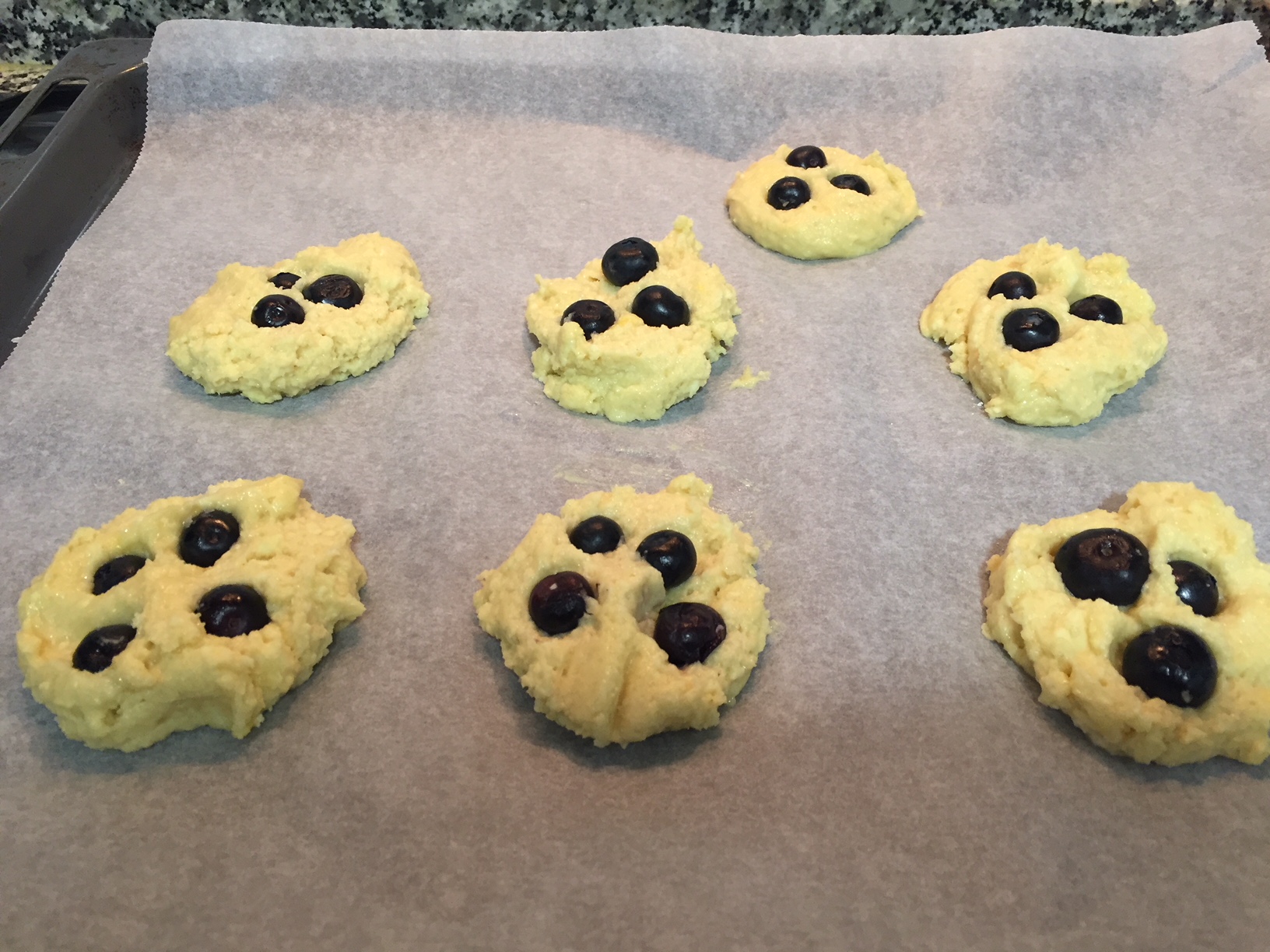 Mezcle 10 seg/Giro Inverso/vel 6. Con una cuchara, coja porciones de masa del tamaño de un huevo (aprox. 50 g) y póngalas en las bandejas preparadas. Ponga 3 arándanos encima de cada galleta y húndalos ligeramente en la masa.