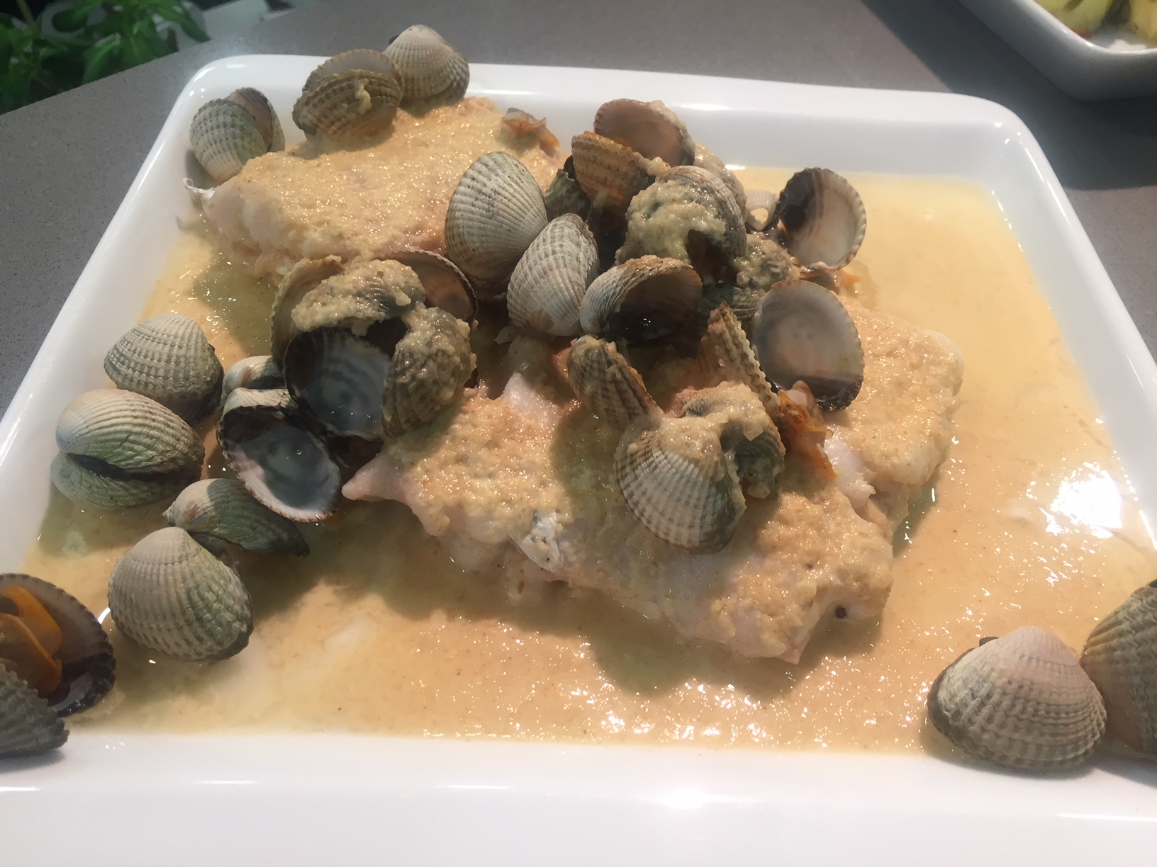 SAN JACOBO DE MERLUZA AL VINO BLANCO Y BERBERECHOS