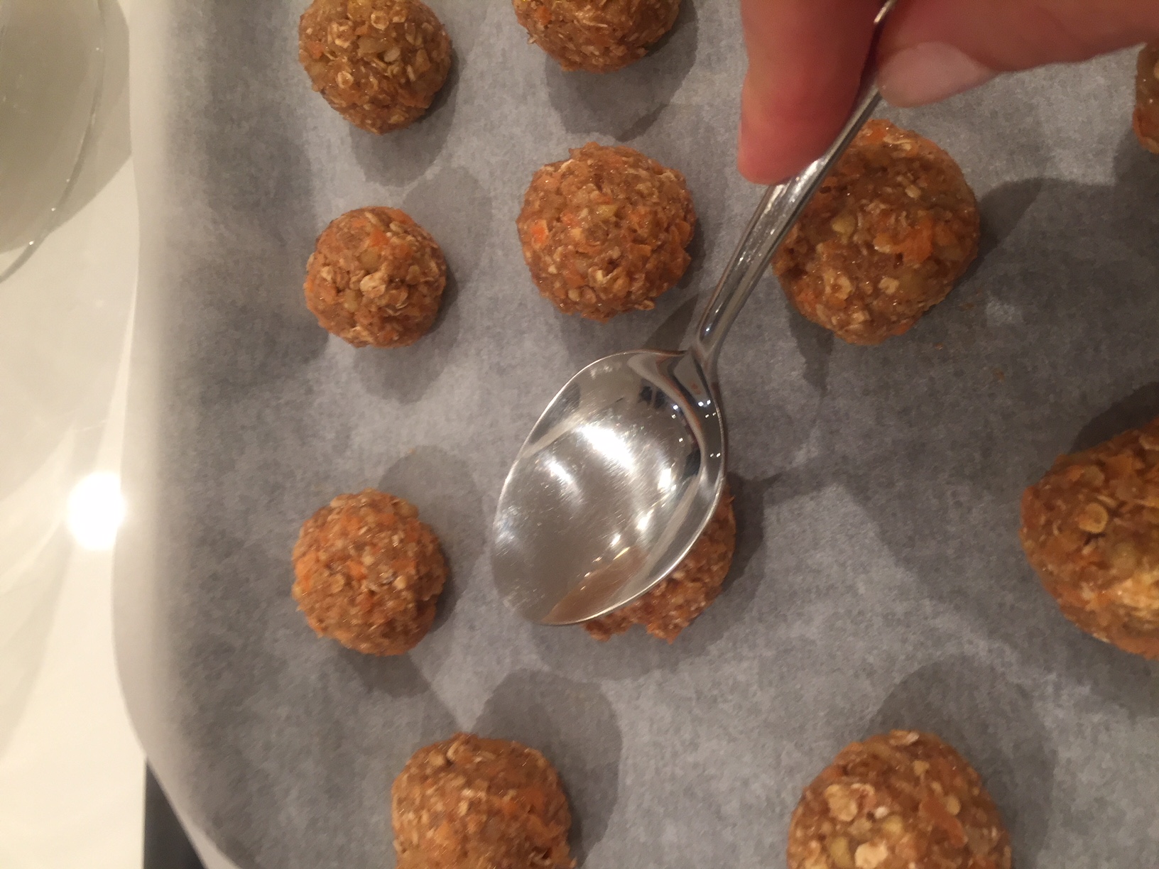 6. Con la ayuda de una cuchara, hacer bolitas con la masa de las galletas e irlas distribuyendo sobre la hoja de papel de horno. Aplastar las bolitas con un tenedor para darles forma plana.