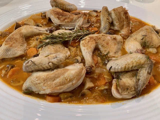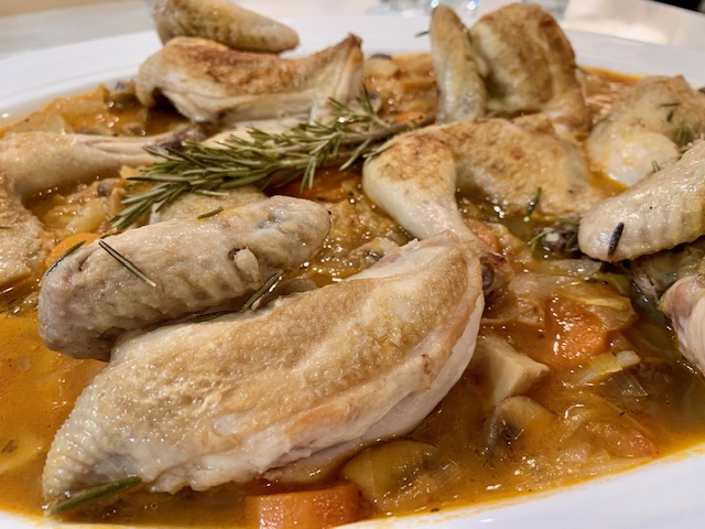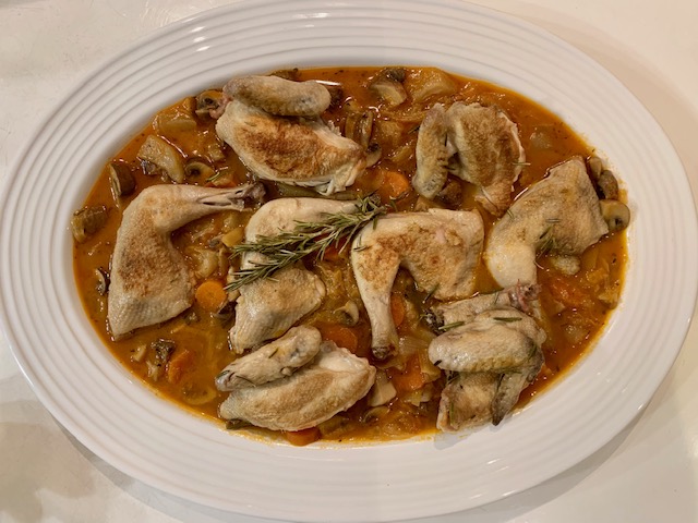 Picantones con guiso de verduras, setas de temporada y pera con Thermomix