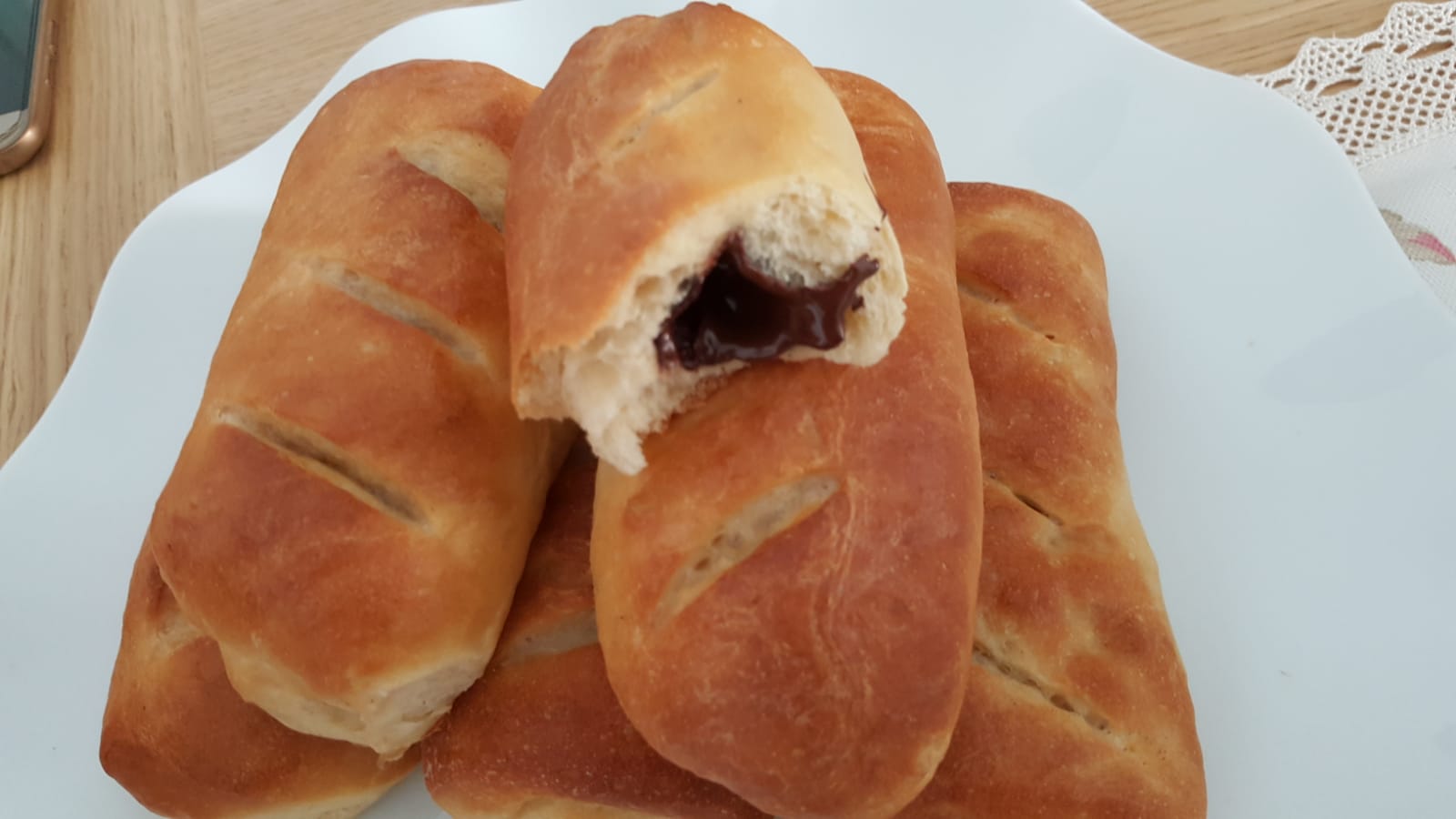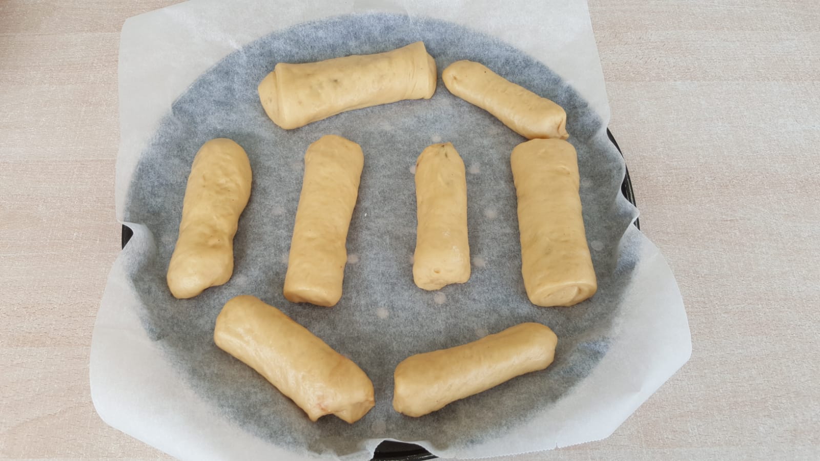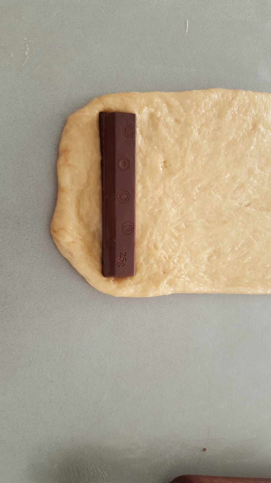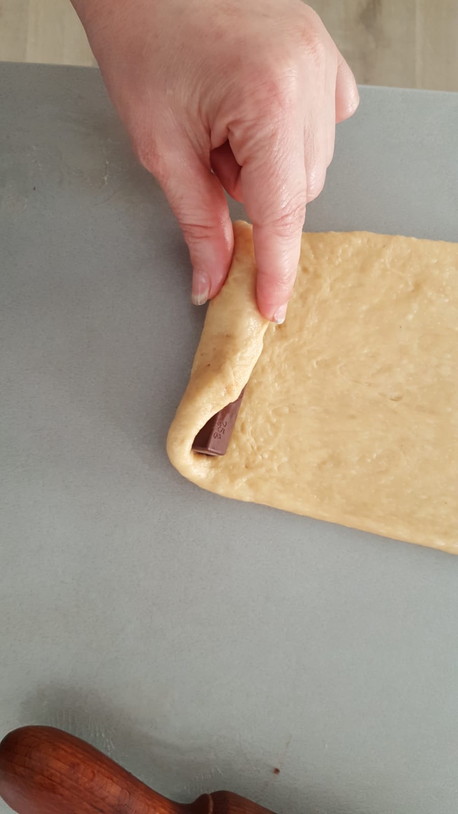 - Con la espátula, baje la masa hacia el fondo del vaso y amase 1 min/ Vel Espiga. Vierta la masa del vaso sobre la superficie de trabajo espolvoreada con harina y amásela ligeramente. Divida la masa en 10 trozos de aprox. 90-95 g. Déles forma de bola y déjelas reposar cubiertas con un paño durante 15 minutos para que la masa se relaje y se pueda trabajar más fácilmente. Aplaste cada bola con los dedos y forme un rectángulo de aprox. 14x10 cm (mientras trabaja con una bola, mantenga las otras tapadas para que no se sequen). Coloque el chocolate en uno de los extremos más largos del rectángulo y forme un rollo. Pellizque la masa en la línea de unión y en los extremos para sellarla
