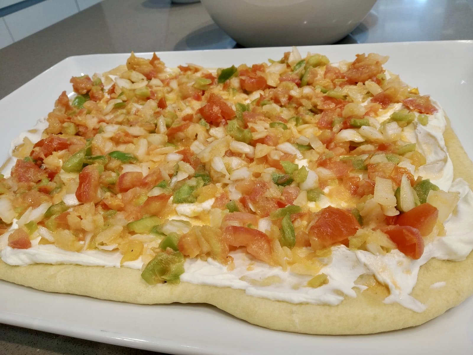 La coca de trempó es una coca salada típica de las Islas Baleares y especialmente de Mallorca. Consiste en una masa de pan plana y cuadrada, con hortalizas cortadas a trocitos. Lleva tomate, pimentón verde, rojo y cebolla. Todo ello aliñado con aceite, vinagre y sal. En este caso he puesto sobre la masa queso de untar que también le da un toque diferente. Esta masa es muy fácil de preparar y para amasar solo hay que mezclar ingredientes. NO se amasa con rodillo, solo con las yemas de los dedos desde el centro hacia los extremos ya que con rodillo se romperá pues la textura de esta masa es así. Hay quien la prepara con manteca de cerdo y eso la hace mas hojaldrada.