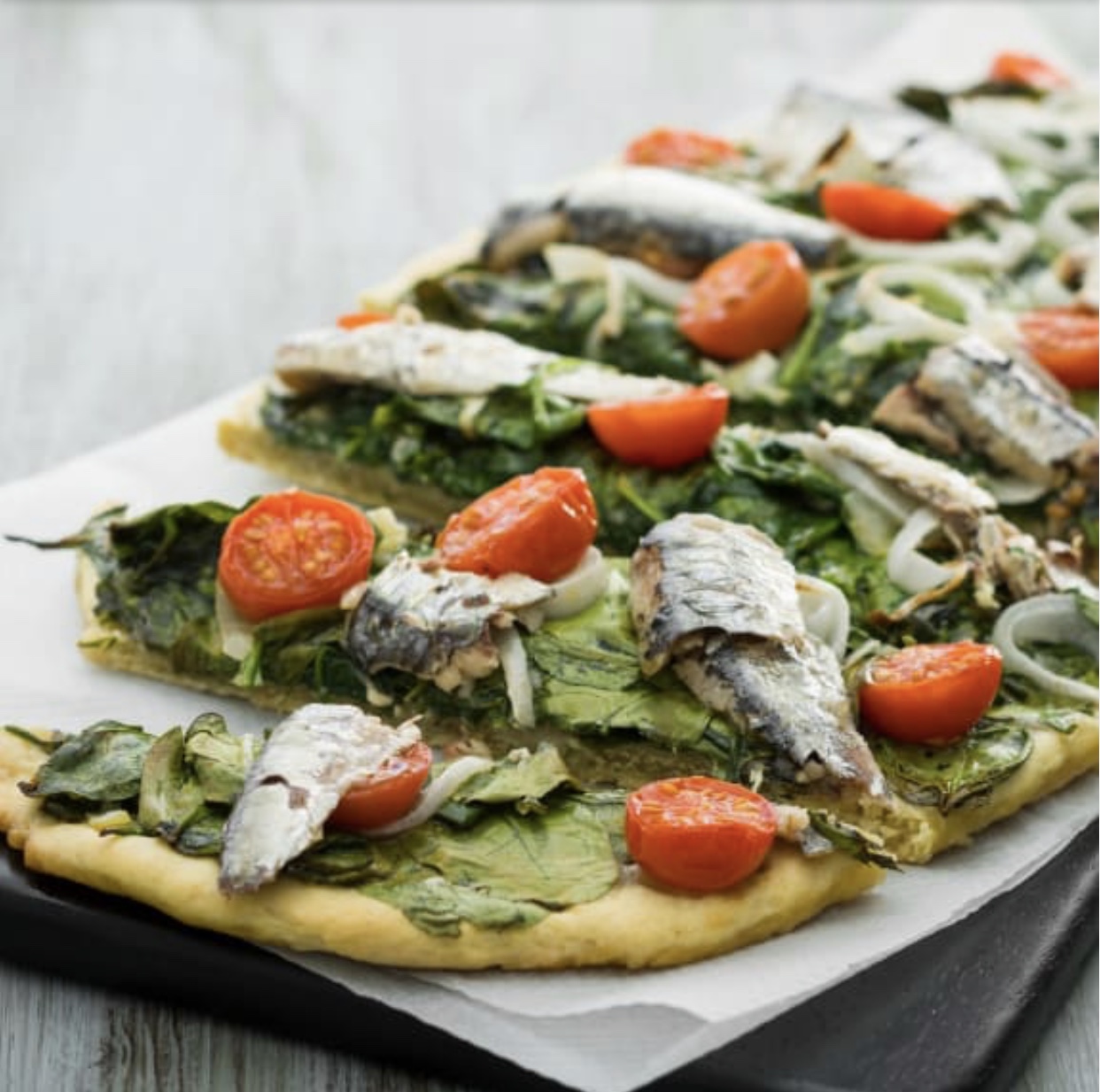 - Hornee durante 20 minutos (200°C). Retire del horno y coloque encima los filetes de sardina (sin espinas). Corte en pociones y sirva inmediatamente.