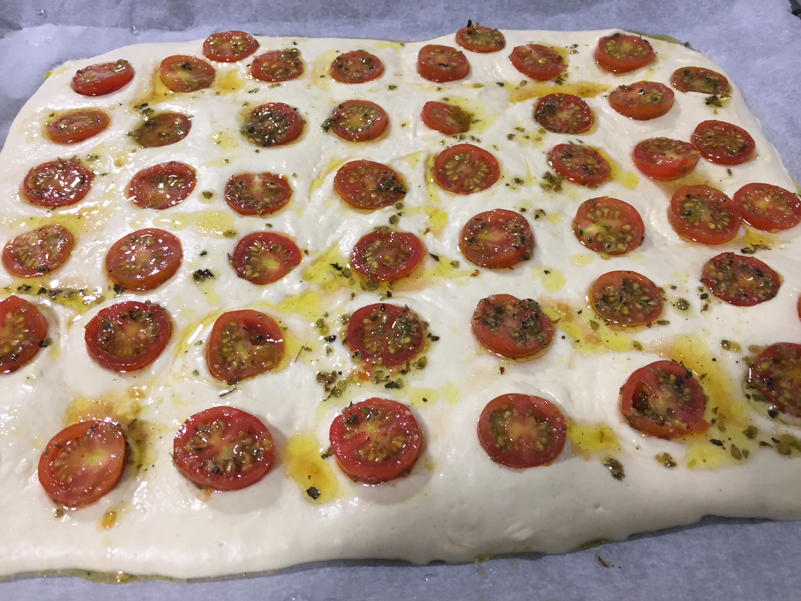- Hornee la focaccia durante 25-30 minutos hasta que la base esté crujiente y dorada. Retírela del horno y deje enfriar (aprox. 1 hora).