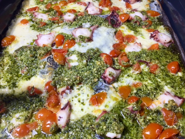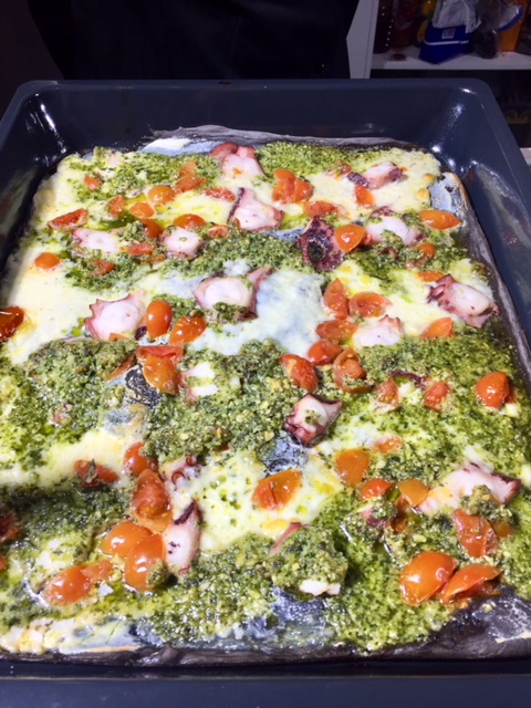 Pizza Al Nero Di Sepia con pulpo y pesto de almendra con Thermomix