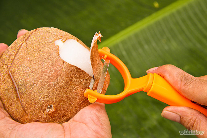 Para evitar este problema, debemos partir el coco por la mitad y calentarlo sobre la llama de un fogón. Una vez que el coco está caliente, su piel se desprende con toda facilidad.
