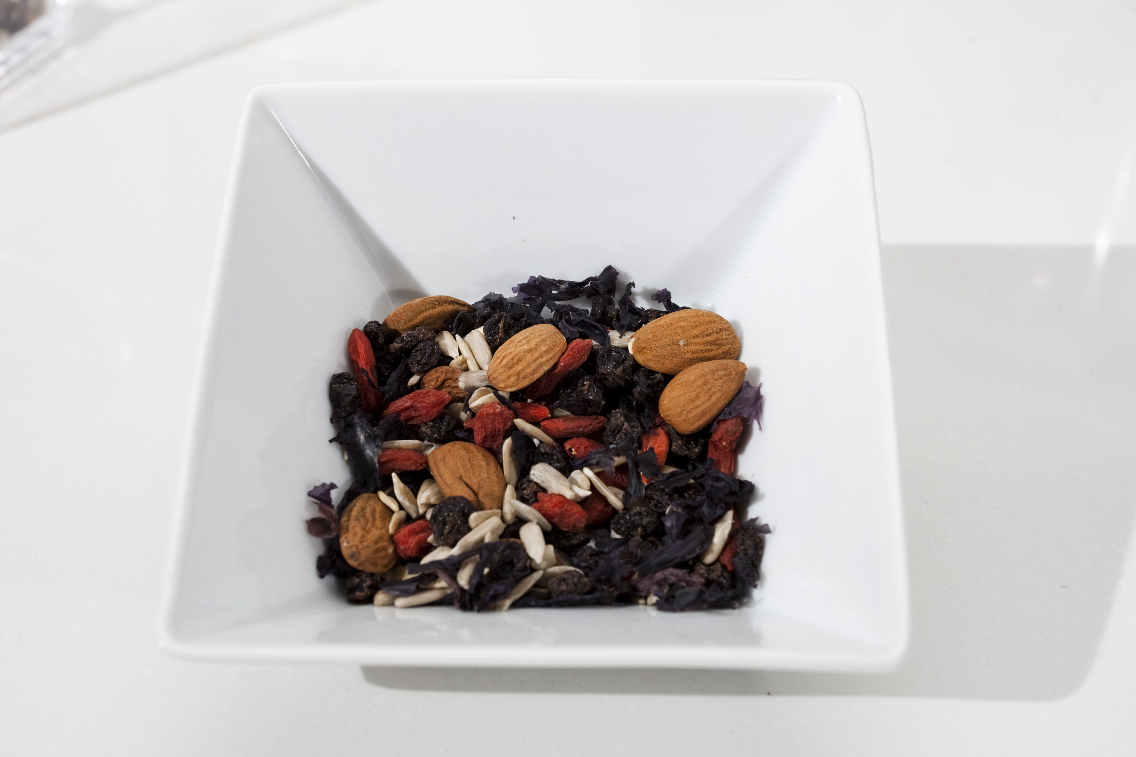 Tritura el alga Kombu unos segundos en la batidora hasta que quede en polvo fino. Mezcla en un cuenco con el resto de los ingredientes y guarda todo en un bote de cristal. Lleva un puñado en una bolsita para tomar como snack energético entre comidas, antes de entrenar, en las tiradas largas corriendo o en bicicleta, e incluso como avituallamiento de un maratón.