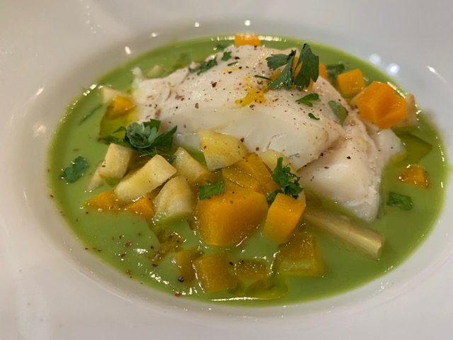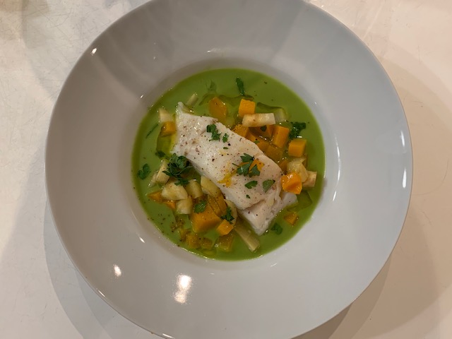 BACALAO AL VAPOR SOBRE CREMA DE GUISANTES Y CALABAZA CON THERMOMIX