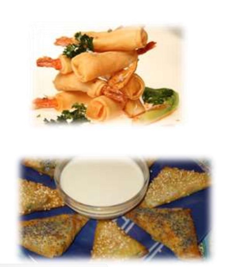 - Partimos las laminas de pasta filo en 4 tiras iguales. Doblamos una de sus puntas formando un triangulo. Debajo de este colocamos 2 cucharadas de relleno y vamos doblando, se nos quedara un triangulo. Lo horneamos pulverizado con aceite y horneamos durante 12 a 15 minutos a 200º.