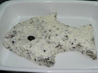 Pon la mezcla en una fuente rectangular y dale forma de pez. Echa un poco de mayonesa espesa por encima para cubrirlo y pon una alcaparra simulando el ojo del pez. Si lo deseas puedes hacer unas aletas con un pepinillo en lonchitas.