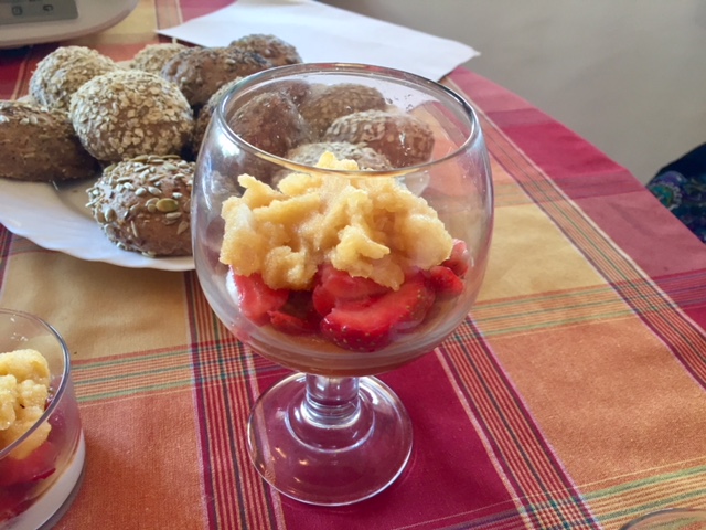 - Distribuya las fresas sobre el yogur y sobre estas el granizado de naranja.