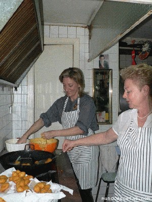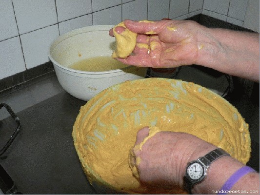 Con una mano coges la masa, y aprietas el puño hasta que la masa salga por arriba y con la otra mano que antes has mojado en agua, coges un poco de masa e introduces el dedo corazón y pulgar en medio para hacerle el agujero y lo fríes.