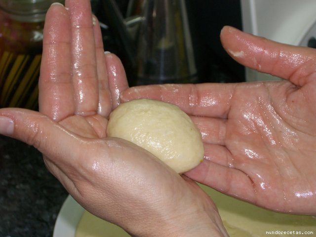 8. Si hacemos pequeñas monas, una vez haya levado la masa y con las manos mojadas de aceite de girasol se van cogiendo montoncitos de masa y se hace fina con las manos redondeando la masa y remetiendo de los lados hacia el centro para que al subir las bolas lo hagan hacia arriba y no se ensanche.
