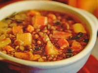 Limpiar las manzanas, pelarlas y cortarlas en cuadraditos. Transcurridos los 45 minutos de cocción de las lentejas, incorporar a la olla las manzanas y dejar cocer 10 minutos más.