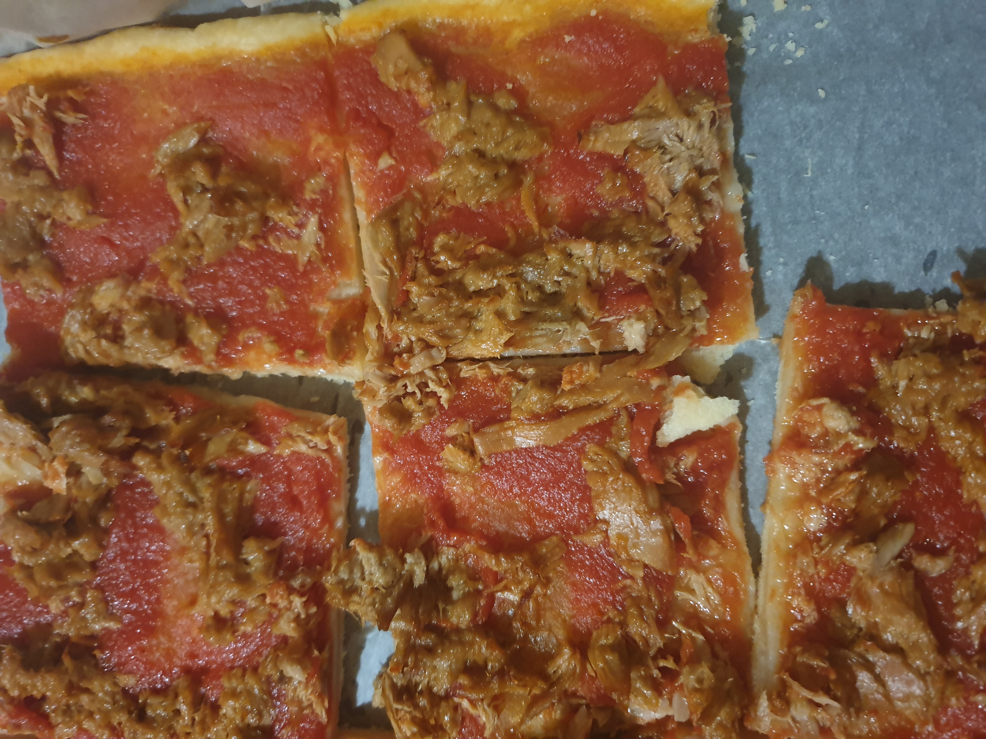 Os cuento un truco: cuando la voy a hacer para cenar, como a mis hijas no les gusta el pisto, pongo por encima de la masa de coca malfeta la mitad con pisto y atún y la otra mitad solo con tomate frito y atún.