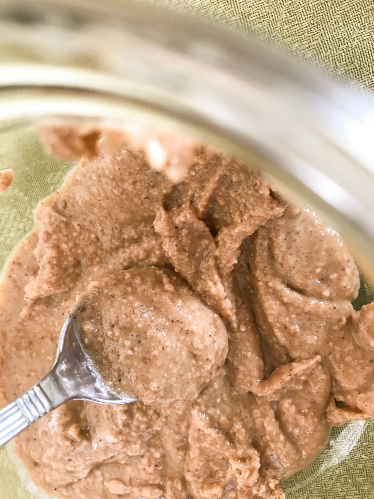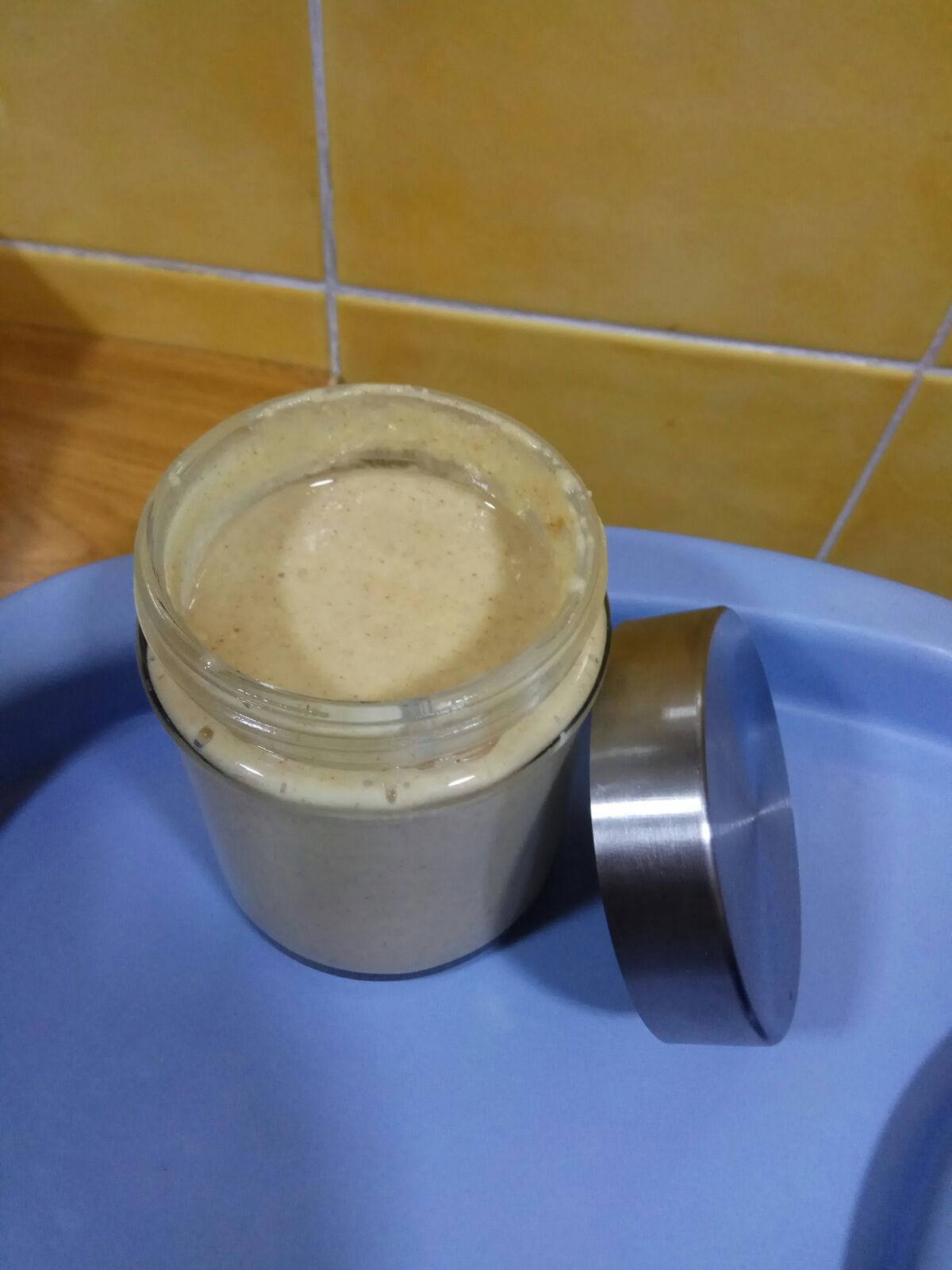 Comprueba la finura, baja con la espátula lo que haya quedado en las paredes y tritura un par de segundos más si lo prefieres. Añade el aceite y el pellizco de sal, y programa otros 10 segundos a velocidad 6. Añade el azúcar si quieres usarla como crema para untar en el pan. Traslada la manteca a un tarro que se pueda cerrar herméticamente.