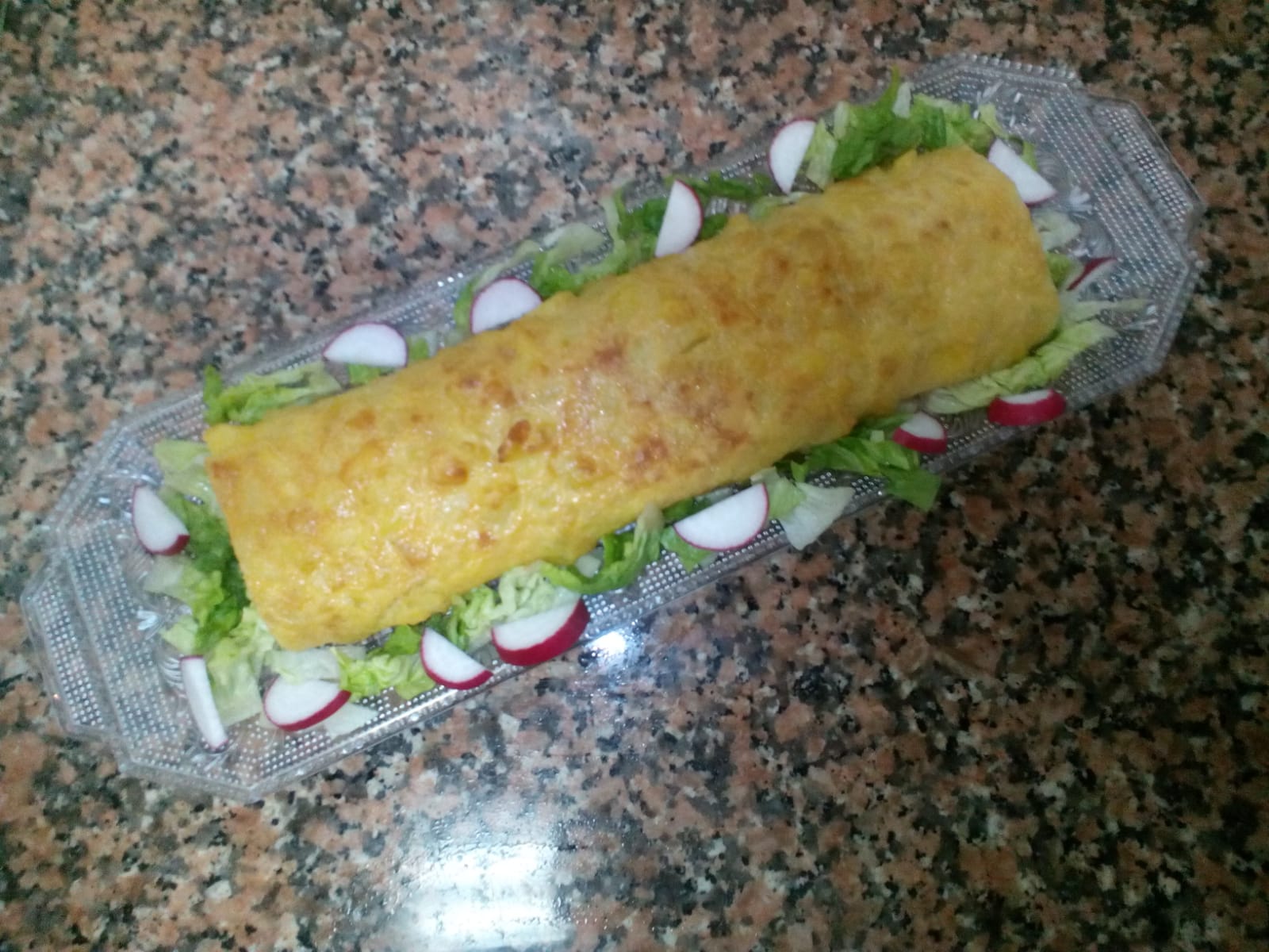 ROLLO DE TORTILLA DE PATATA CON JAMON ,QUESO Y PIMIENTO