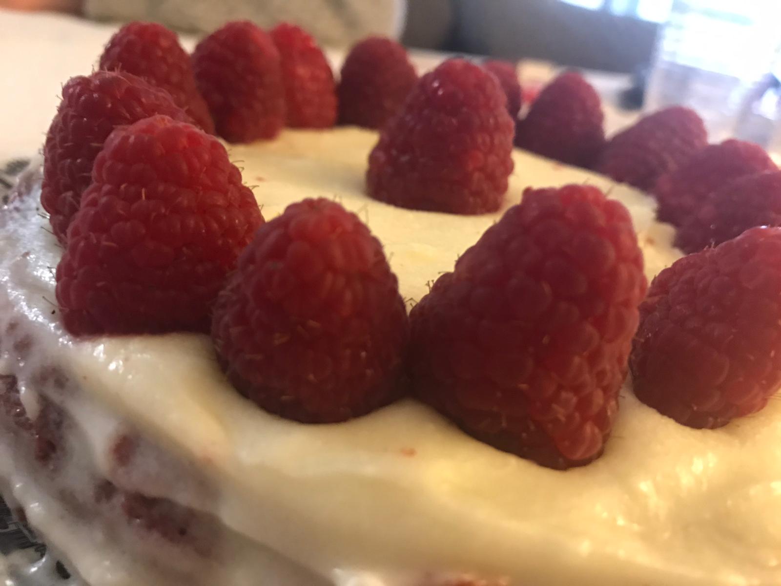 8. Una vez que están fríos los bizcochos utilizaremos uno para cada tarta. Colocamos un bizcocho sobre un plato y lo partimos transversalmente en en dos o tres rebanadas, extendemos un poco de frosting por encima y colocamos encima otra rebanada. Coronamos con frosting por encima y por los laterales. Si lo deseamos espolvoreamos con migas del bizcocho que seguro se nos han quedado adheridas al molde.