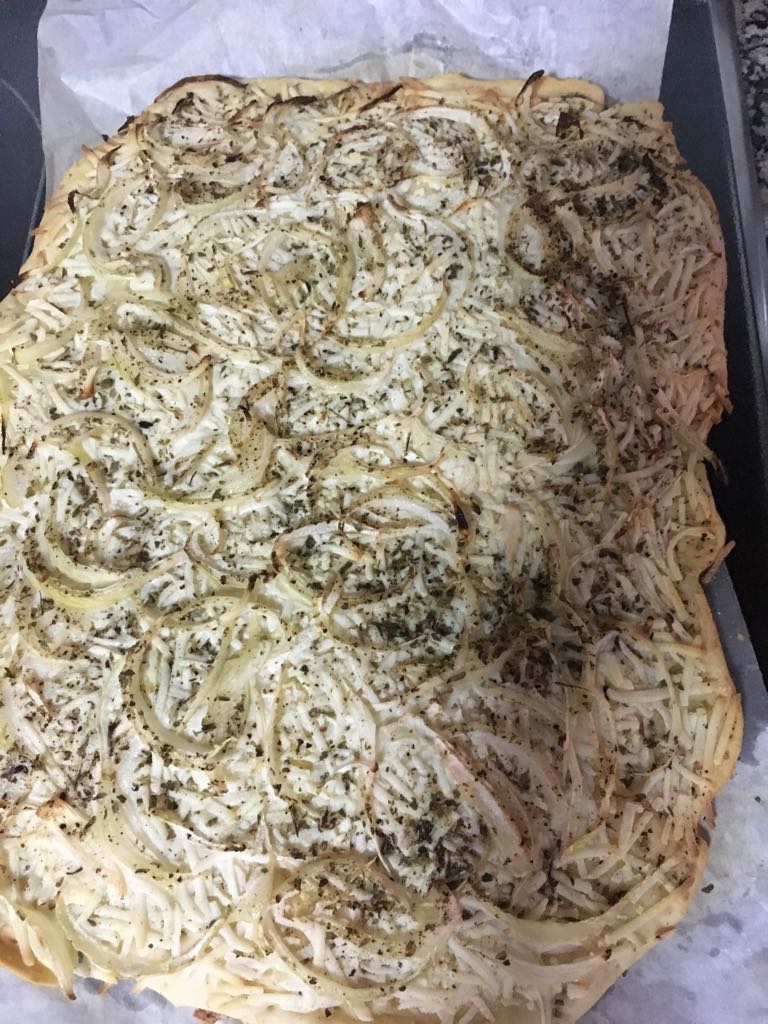 Spread onions on top of dough and scatter with rosemary ,bake for 20-25 minunes(220º) or until golden brown .Allow to cool before cutting into squares and serving.