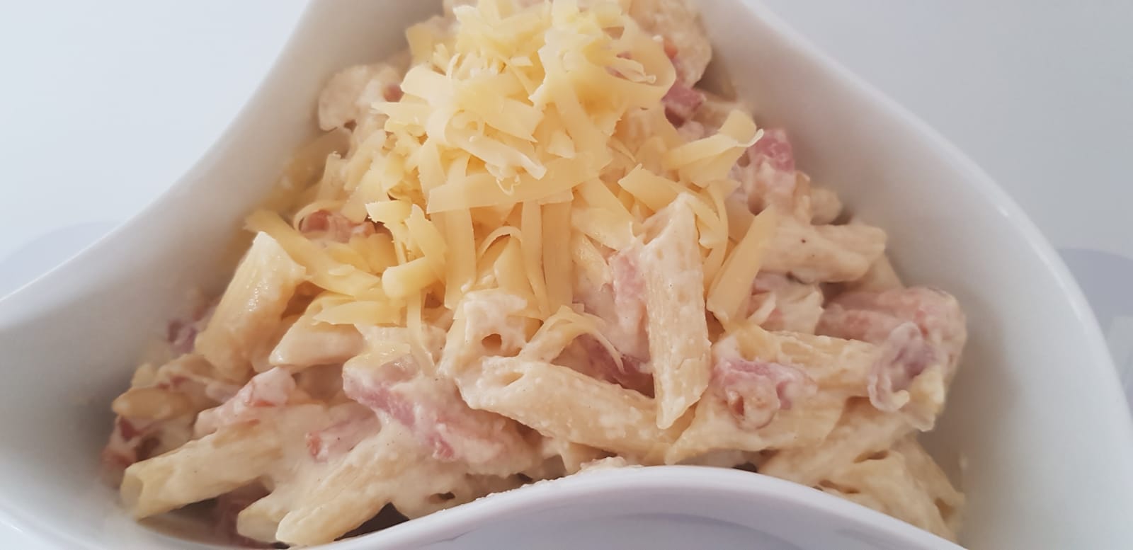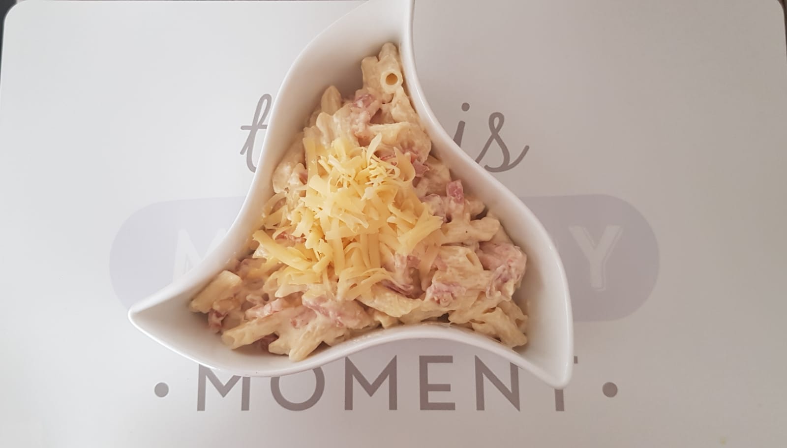 Añada la nata, el agua, la sal y los macarrones y programe programe el tiempo indicado en el paquete/100°C/giro inv./vel cuchara.