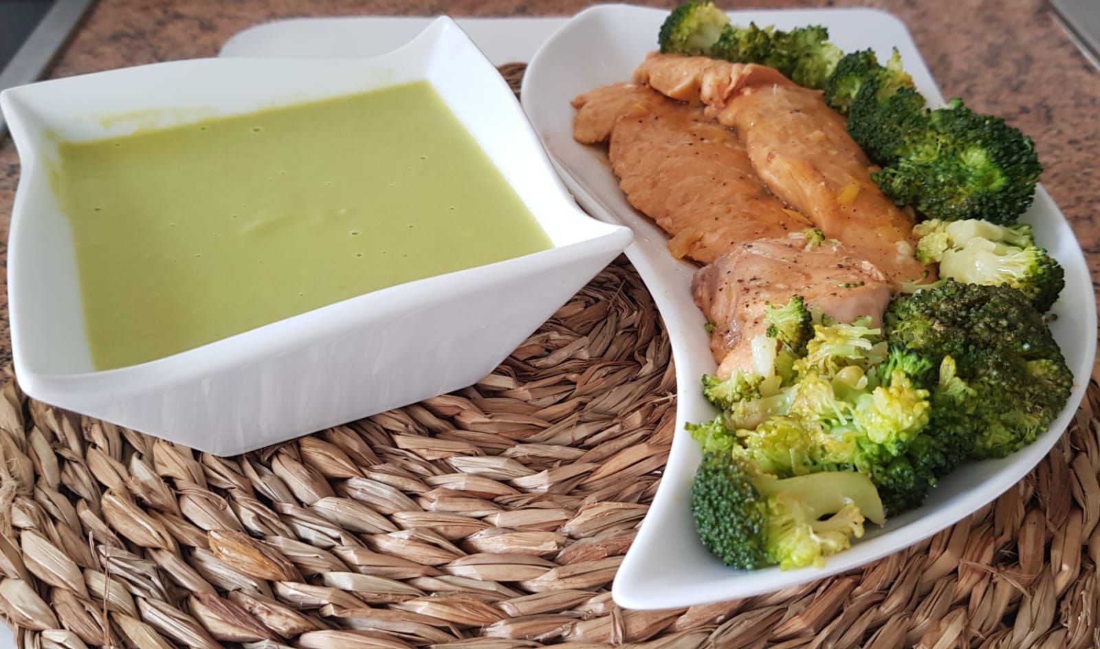 Sopa de guisantes y jengibre. Salmón al limón con brócoli by Montse