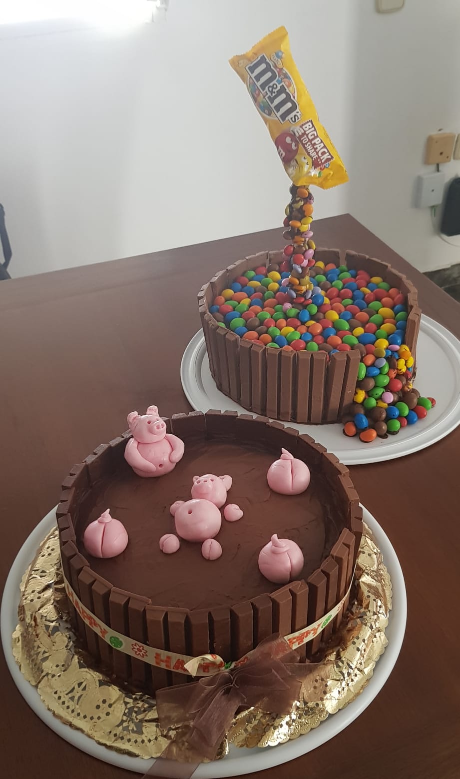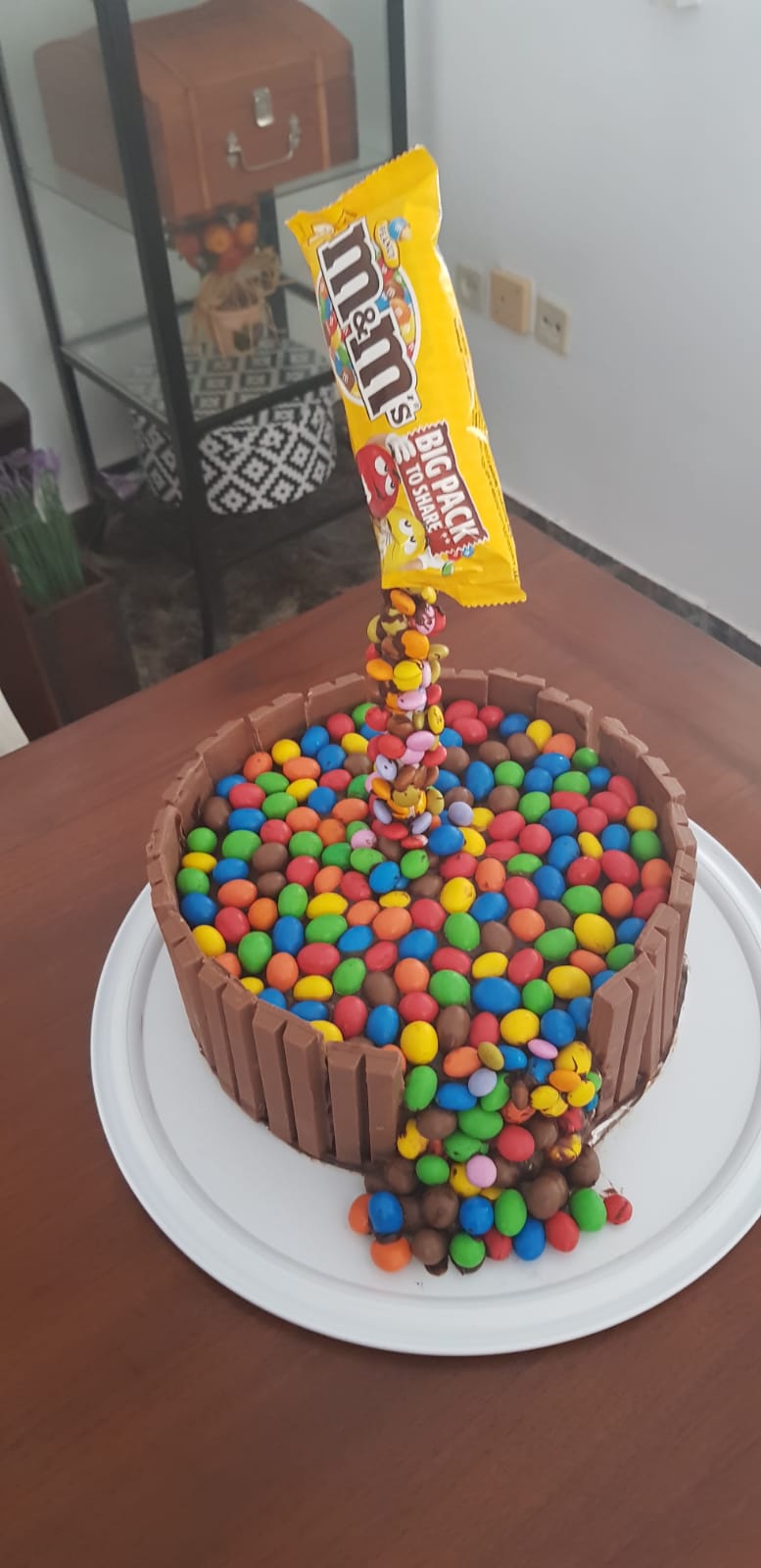 vamos colocando kit-kats alrededor de toda la tarta, dejando una parte sin poner (será por donde caen los lacasitos y los conguitos). Se pegan perfectamente a la crema pastelera. En este punto, es conveniente meter la tarta, según está, en la nevera y dejarla reposar un par de horas, para que la butttercream y el bizcocho se asiente y sea más fácil luego hacer el resto de la decoración.