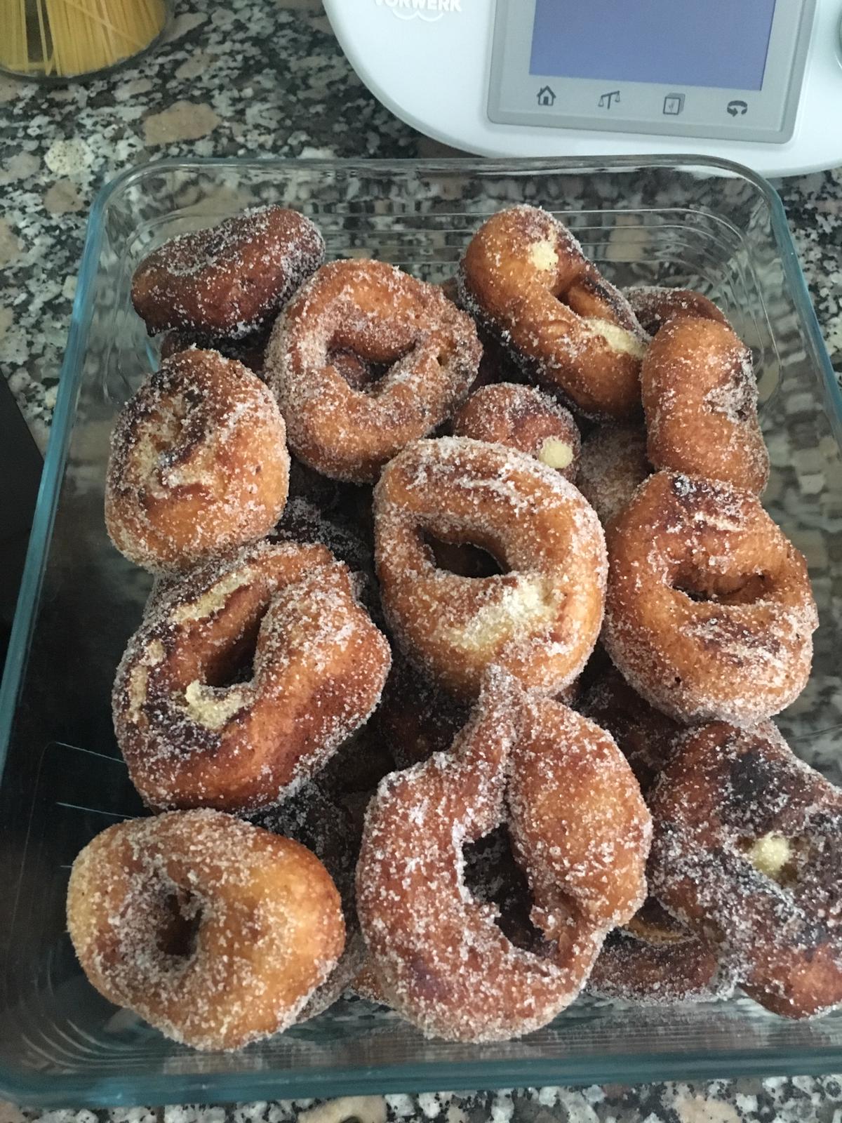 Caliente el aceite a fuego medio en una sartén honda para freír. Con las manos untadas en aceite, forme bolas (10-12 g) del tamaño de una nuez. Únalas de dos en dos y presione en el centro con el dedo para formar las rosquillas abriéndolas un poco. Vaya friéndolas en el aceite caliente. Escúrralas sobre papel de cocina y rebócelas en el azúcar. Deje enfriar y sirva o conserve en un recipiente hermético.