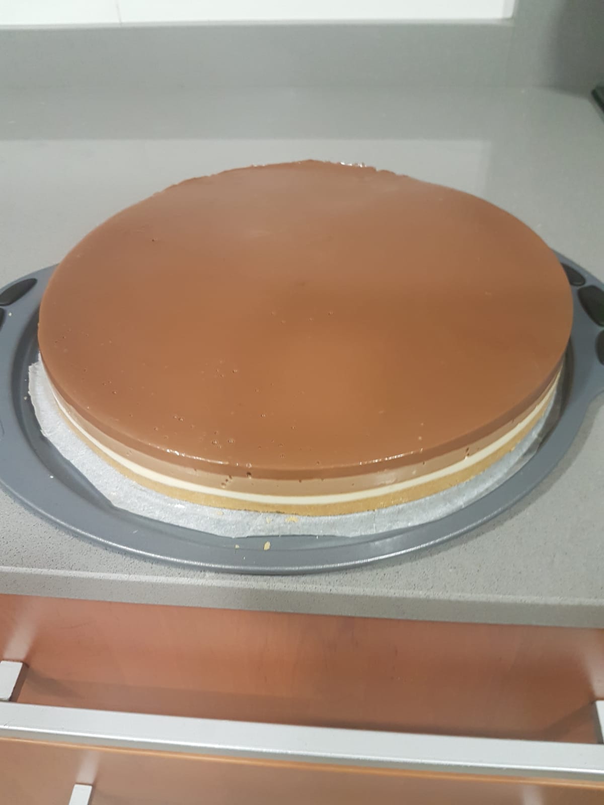 Para la capa de chocolate negro: 200 g de chocolate negro, 200 g de nata con 35%MG, 200 g de leche, 1 sobre de cuajada.