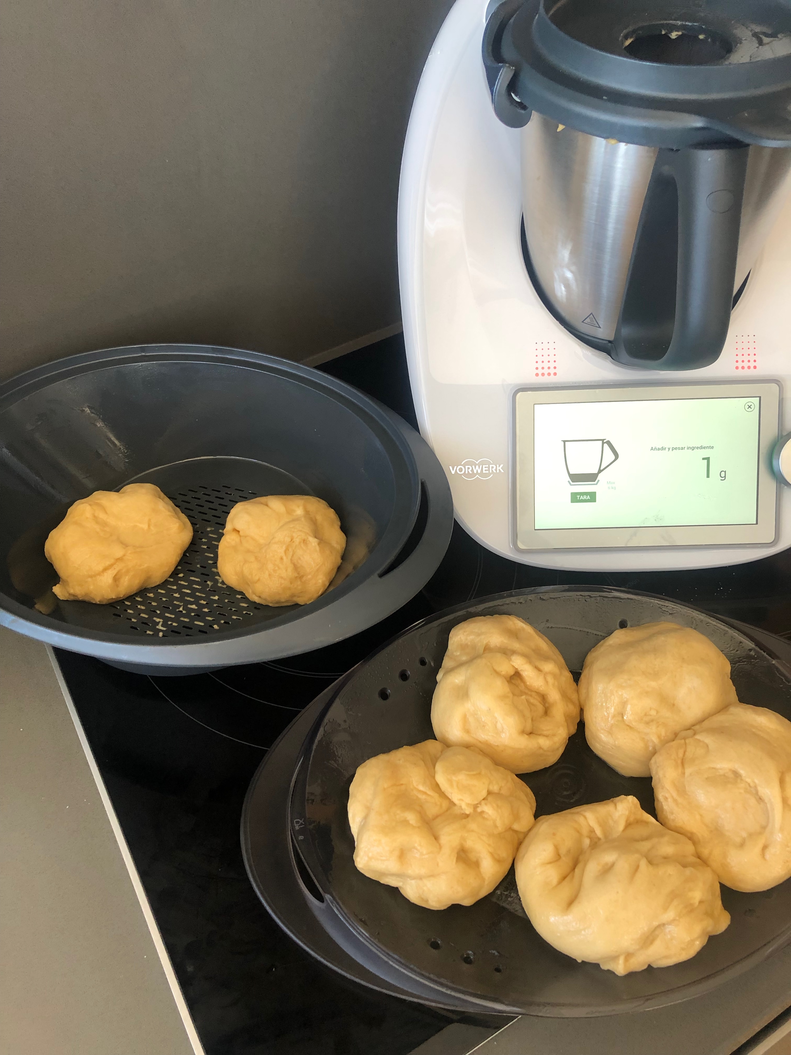 5. Por último ponemos la harina mezclamos 10 seg/vel 6, después programamos 5 min/ funciona amasar. La masa después de un par de minutos tiene que dar vueltas soltándose de las paredes, si no es así, añade harina a cucharitas pequeñas hasta que se suelte de las paredes.